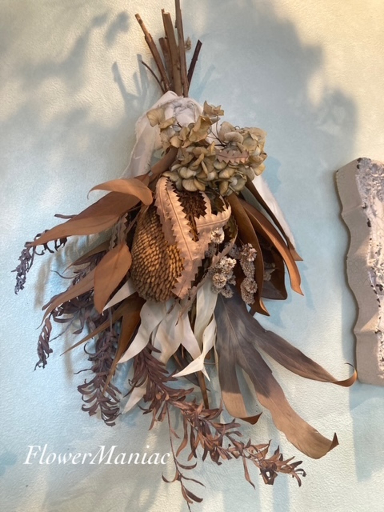 自然の風合いをそのまま閉じ込めた、ドライフラワーのスワッグ。